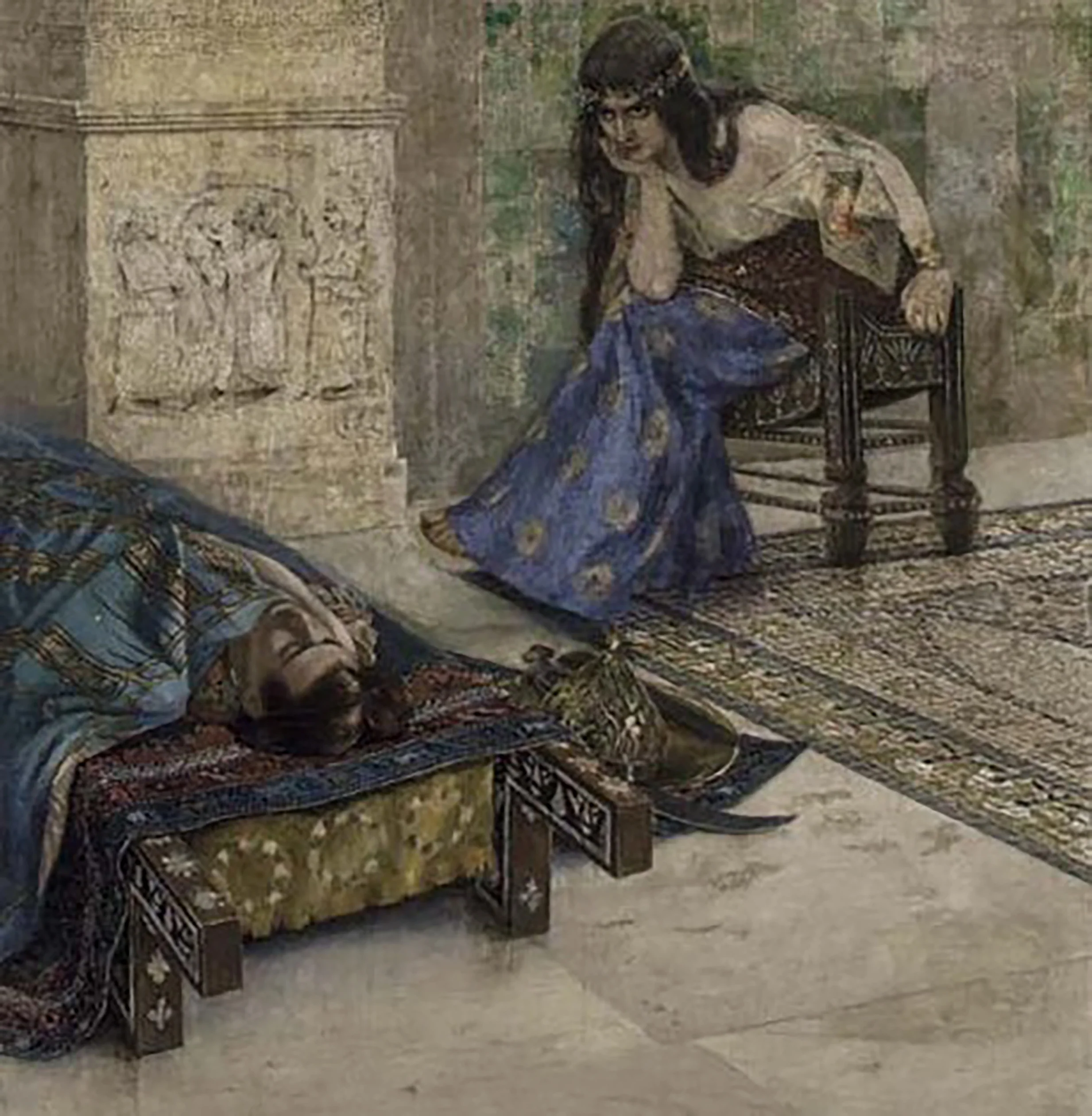 Семирамида, сидя у изголовья своего возлюбленного, обращена внутрь себя. На ее лице читаются смятение и отчаяние. В пространстве картины время словно остановилось, становясь еще одним ее персонажем. Бесповоротность произошедшего и драматизм переживаний сливаются воедино.