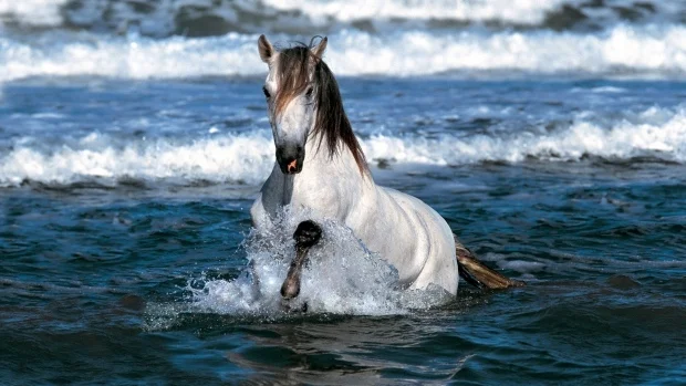 На рассвете из моря выскочил белый красавец конь и трижды облетел землю. Когда он стал валяться в песке, младший сын вскочил на него и, как змея, прильнул к его шее.