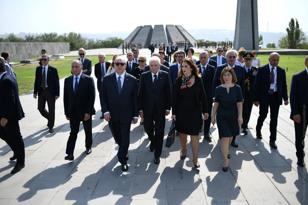 Сегодня президент Италии в сопровождении президента Армении посетил «Цицернакаберд» — мемориальный комплекс, посвященный памяти жертв Геноцида армян. Итальянская делегация возложила венок к мемориалу и цветы — к вечному огню, который призван напоминать о трагически погибших людях.