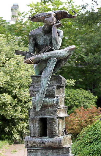 Итак, шут — аллегорический образ правдолюбца. В руках скульптурный шут держит раскрытую книгу. Он унесся мыслями вдаль, читая сказку-притчу Экзюпери «Маленький принц», поведавшую простые истины. Маленький принц такой же правдолюбец, который, путешествуя по разным планетам, дивится причудам и странностям взрослых.