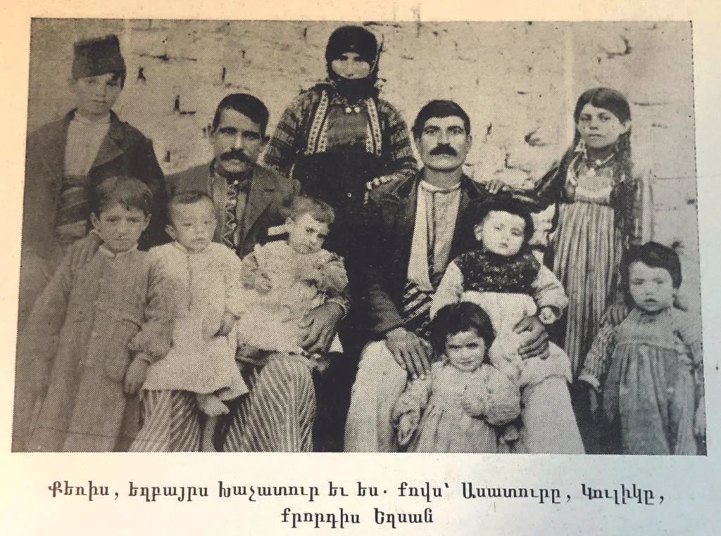 Подпись:мой дядя по материнской линии, мой брат Хачатур Хароян и я (мальчик в феске). Рядом со мной: Асадур, Гулиг Хароян (в центре, задний ряд) и дочь моей сестры Егсан (девочка с косами). Источник
