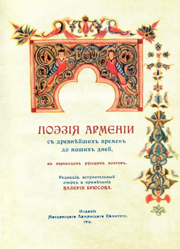 3. Поэзия Армении с древнейших времен до наших дней. Под редакцией, со вступительным очерком и примечаниями Валерия Брюсова. [М.]: Московский Армянский комитет, 1916;