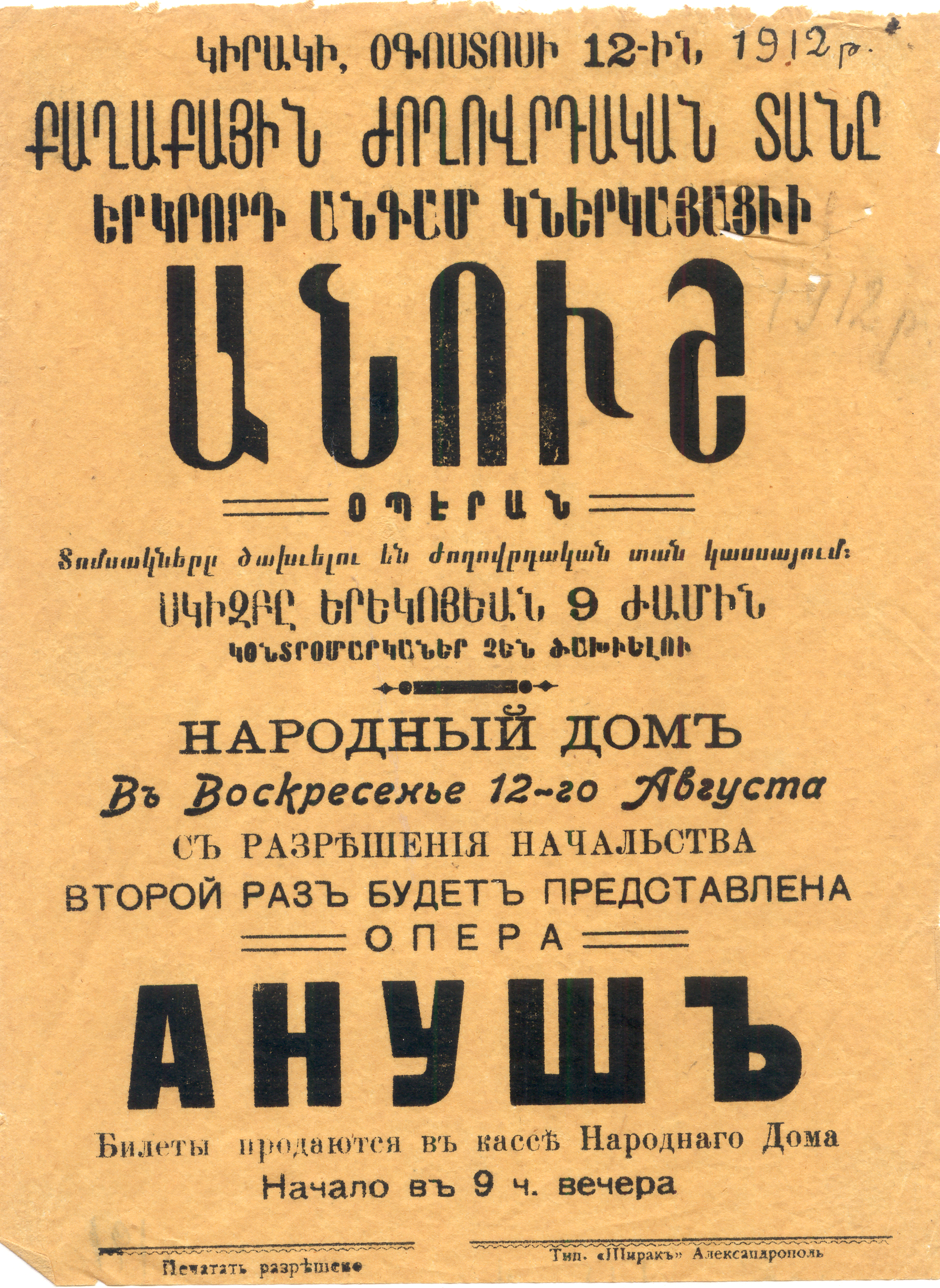 Афиша второго представления оперы «Ануш», состоявшегося 12 августа 1912 года в Городском народном доме Александрополя. Источник