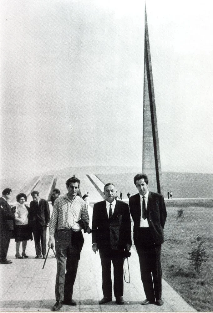 Мемориальный комплекс Цицернакаберд — совсем иная история. В 1965 году был объявлен конкурс на проект, посвящённый жертвам Геноцида армян 1915 года. В финале конкурировали несколько работ, и в итоге был выбран проект Артура Тарханяна и Сашура Калашяна. В 1967 году мемориал открылся. Двенадцать базальтовых плит, поставленных под углом и образующих замкнутый круг, — их интерпретировали по-разному: застывшее пламя, склонившиеся фигуры, лепестки незабудки. Рядом — 44-метровая стела с глубоким вертикальным разломом вдоль всей высоты: расколотый народ, меньшая часть которого осталась на родине, большая ушла в диаспору. С 1967 года каждое 24 апреля сюда приходят тысячи людей.