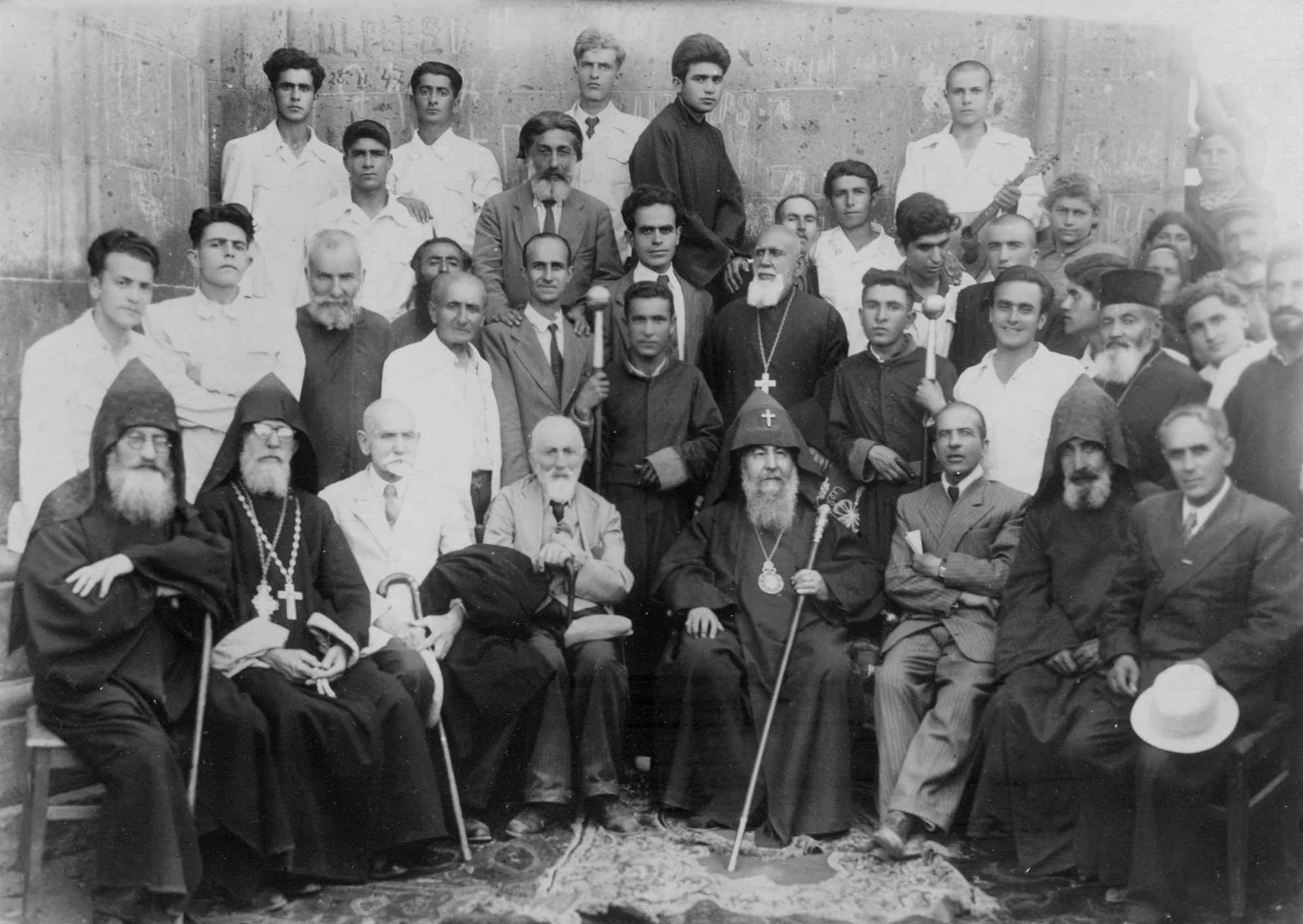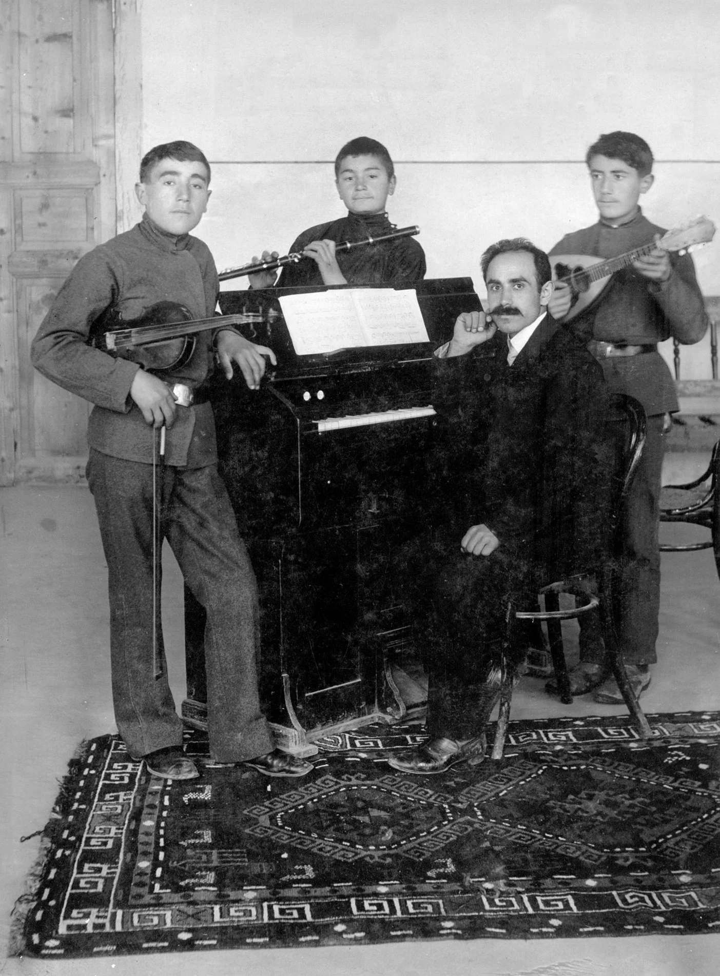 Даниел Казарян с сестрой Анаидой Казарян и композиторами Азатом Манукяном, Ваганом Умр-Шатом и Арменом Тиграняном, 1925 год. Источник