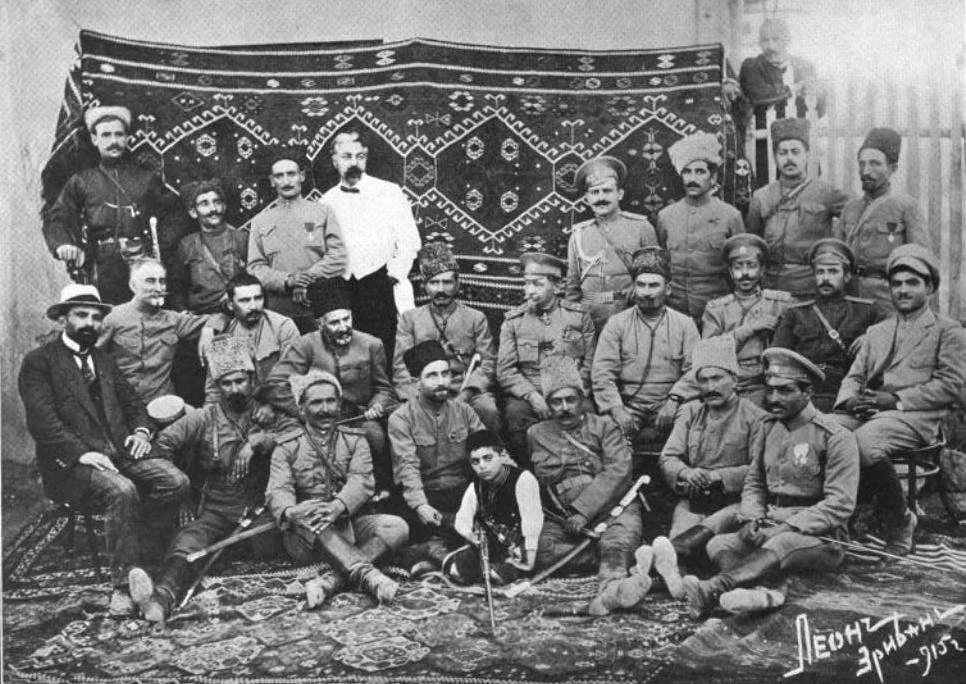 Лидеры армянских добровольцев (Андраник по центру) и самый юный армянский доброволец, спасённый от турок. 1915 г. Источник