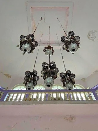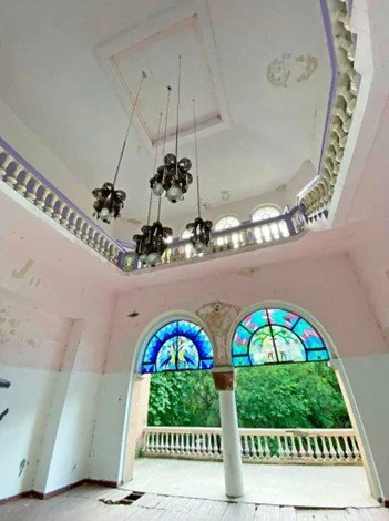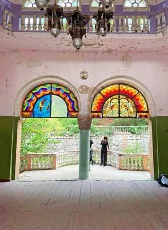 Полукруглые арки первого этажа украшены разноцветными витражами с изображениями птиц, цветов, геометрическими узорами. В былые времена по боковым лестницам посетители могли подняться на второй ярус, с внешней стороны выделенный с двух сторон полукруглыми балкончиками и балюстрадами. Венчает здание выразительная башенка со шпилем.