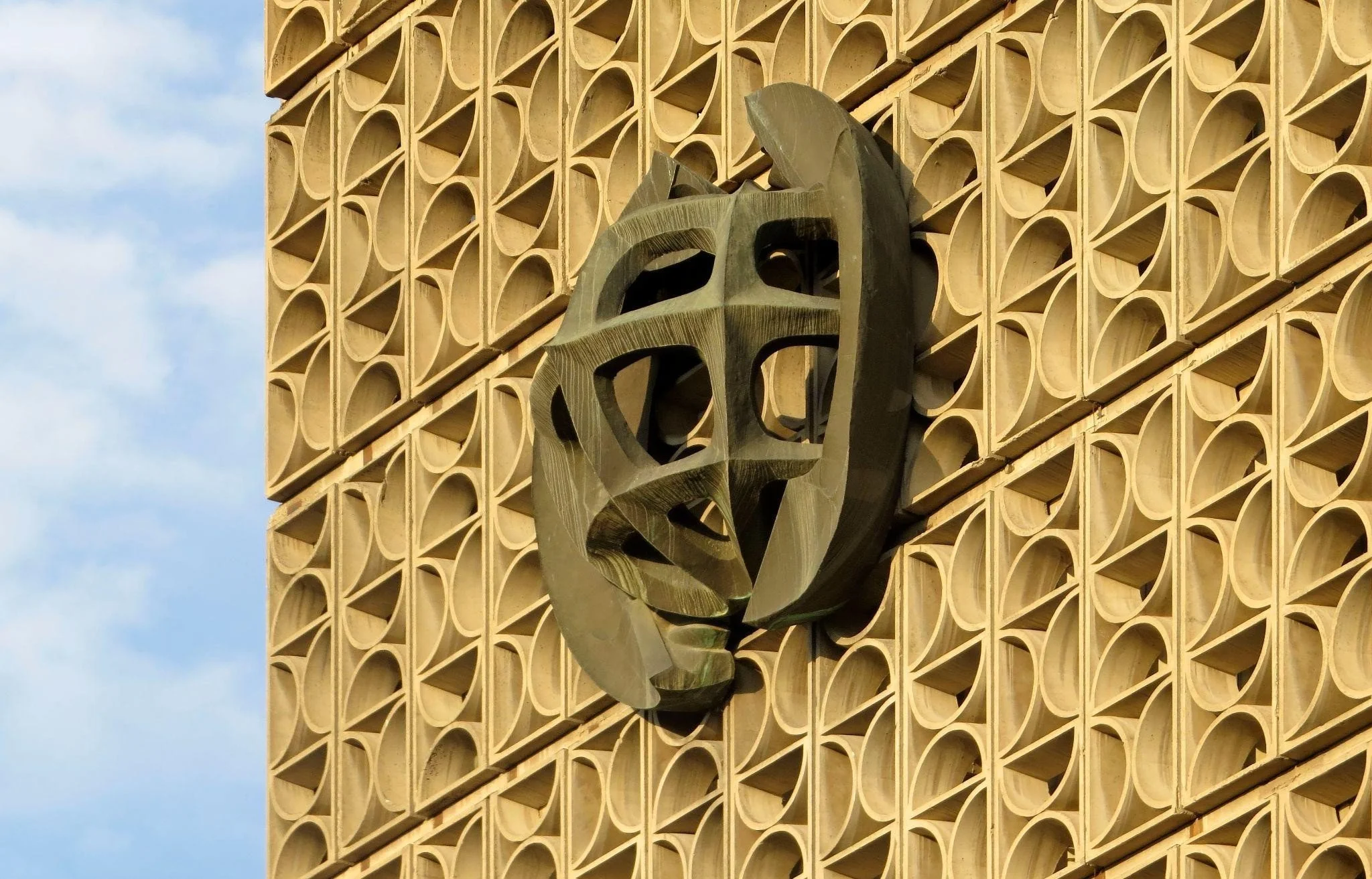 Самый большой бронзовый горельеф — на западном фасаде, на уровне второго этажа стилобатной части. В центре композиции — женская фигура с поднятыми руками, у неё за спиной — искусственные спутники Земли, звёзды, планеты и парящие космонавты. Внизу — две женщины по обеим сторонам, как кажется, разговаривающие друг с другом по телефону. Между ними — серьёзного вида рабочие, держащие невидимый кабель, будто намекая на перспективы развития беспроводной связи. Здесь же рядом — люди, многозначительно указывающие на свои уши.