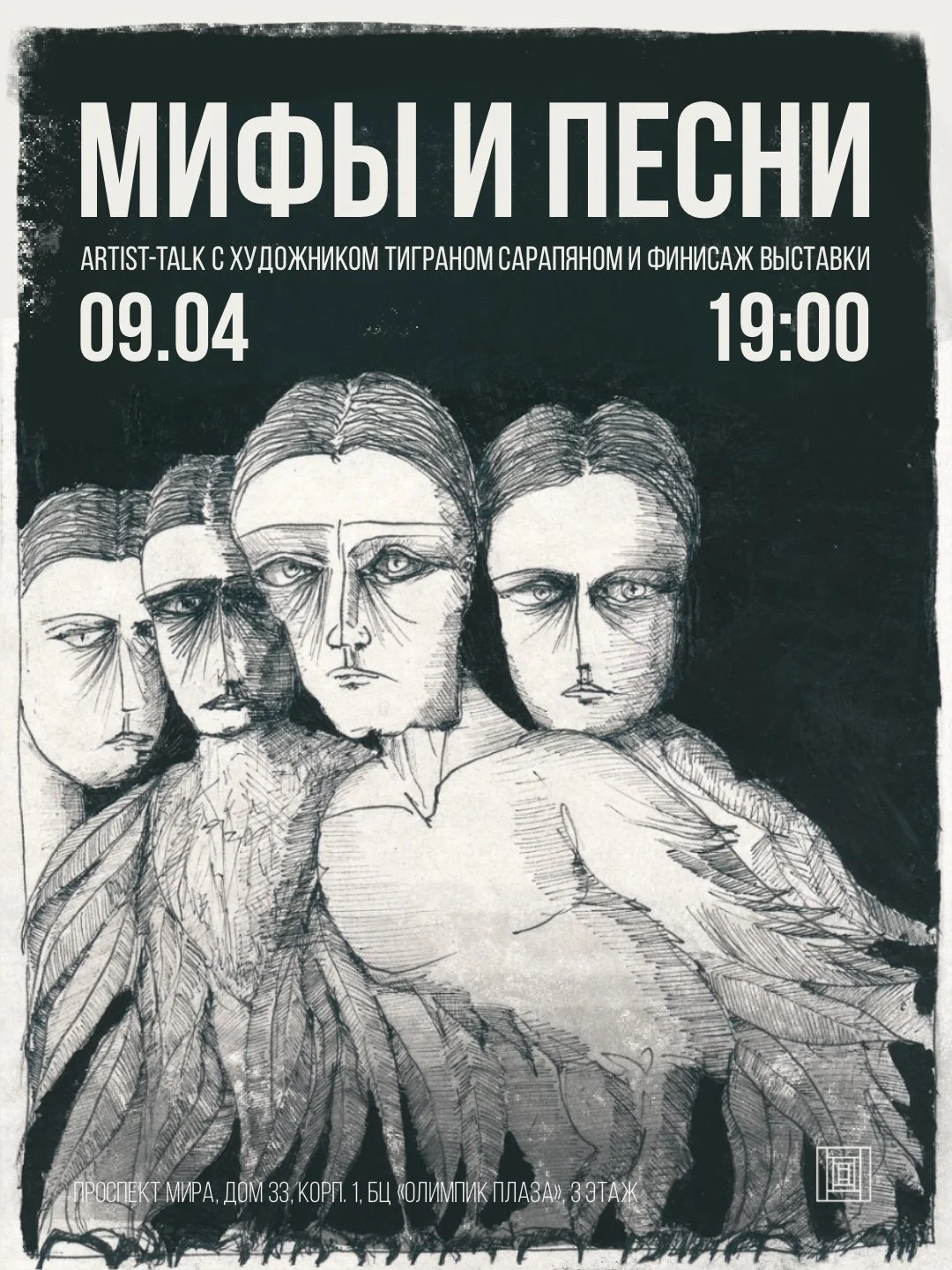 Художник и скульптор Тигран Сарапян родился в Армении, учился в Ереванском государственном университете архитектуры и строительства, и именно профессия архитектора, по его словам, оказала ключевое влияние на его творческий метод, выбор персонажей и тем. Зоркий зодчий пристально всматривается в пространство человеческой души, соотнося его законы с архитектурными. Герои графических историй Сарапяна, представленных на выставке «Мифы и песни», повествуют о взаимоотношениях с собой, окружающим миром и собственной судьбой.