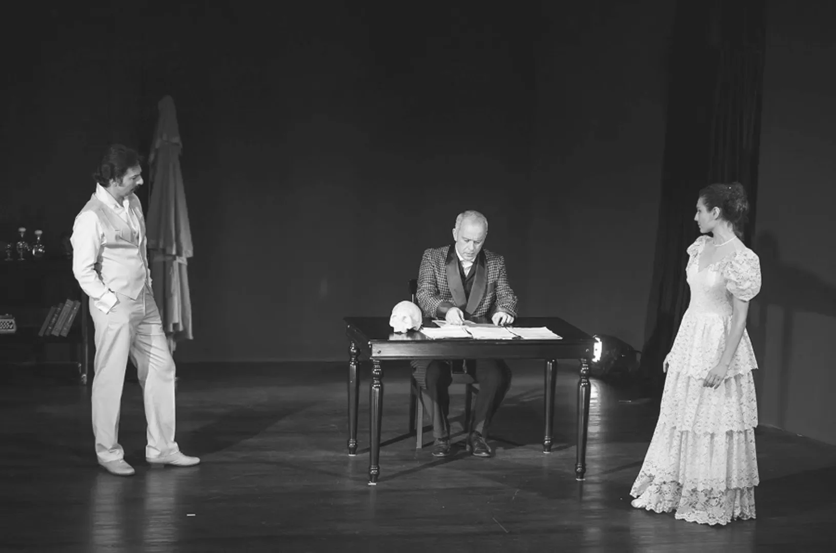 Сцена из спектакля «Кто там?» / «Последний Гамлет Мухсин бея», поставленного театральным клубом Университета Босфора (Стамбул). В преклонном возрасте Эртугрул ведёт монолог с двумя призраками из прошлого — один из них Ваграм Папазян, его друг юности и первый учитель. Источник